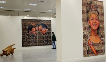 Los dos cuadros incluidos en la exposición de Salamanca, donde aparece Rajoy, Bárcenas y la infanta Cristina con heces en la cabeza. /