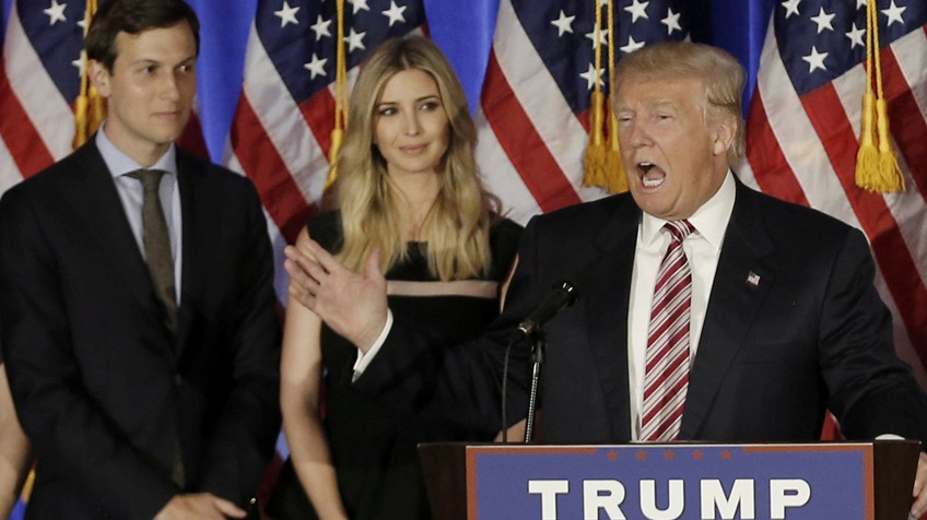 Trump, durante un discurso, con su yerno Jared Kushner y su hija Ivanka. REUTERS