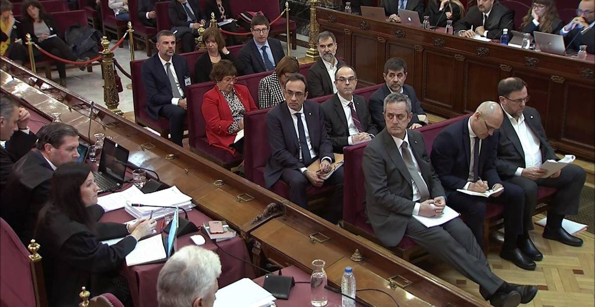 Banquillo de los acusados, en una imagen tomada de la señal de televisión del Tribunal Supremo. EFE La Fiscalía contrataca PABLO ORDAZ Madrid 76 El ministerio público y la Abogacía del Estado hacen un encendido alegato en favor de la instrucción y proclaman: “Esto es un juicio en defensa de la democracia” La contundencia de la Fiscalía augura un juicio de alto voltaje