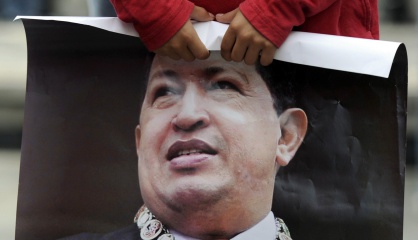 Un niño sujeta un cartel con la imagen de Hugo Chávez. /