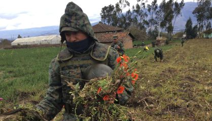 Militares en Ecuador destruyen un campo de flor de amapola. /